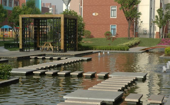 豐富的水系和現(xiàn)代城市景觀相結(jié)合的獨(dú)特的萬象新天情調(diào)商業(yè)內(nèi)街,有著街頭綠地、大型種植、休閑小品、沿街遮陽飄蓬等多種情趣元素,而水體則自由散漫其中。豐富的水體、變化的綠地、多種硬質(zhì)鋪裝和沿街的飄棚、休閑小品等元素的結(jié)合,讓萬象新天的商業(yè)內(nèi)街突出了休閑功能,使其形成了社區(qū)居住者的共享客廳,成為“萬象新天”繼城市空間之后的第一度過渡空間。