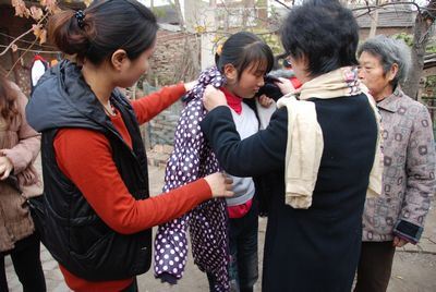 下午2點(diǎn)多,大家來到了環(huán)衛(wèi)工人楊玉枝在向陽路租住的房子,袁洋姐弟倆一直與奶奶相依為命,楊玉枝老人就靠微薄的收入供兄妹二人上學(xué)和生活,家庭十分貧困。當(dāng)她看到我們一行人帶著溫暖走到她的家里時(shí),頓時(shí)熱淚盈眶,口中一直在感謝。告別了楊玉枝家,我們驅(qū)車趕到許昌市北環(huán)以北的老吳營看望另外兩家春蕾女童。這兩家情況也是相當(dāng)因難的,特別是住在老吳營八組的王明明同學(xué),因自幼母親去世,父親為了養(yǎng)家在西安打零工,目前和姥姥生活在一起,在周圍的一棟棟二層小樓的環(huán)繞中,一座破落小院就是她的家,主房是兩間破瓦房,屋內(nèi)的地面還是坑洼的土地,站在屋里比在屋外還要濕冷。但是這女孩學(xué)習(xí)很努力,連年被評(píng)為三好學(xué)生?吹轿覀兊牡絹恚⒆拥睦牙堰h(yuǎn)遠(yuǎn)的就迎了上來,拉著手把我們請(qǐng)到家中,劉主席和王總一起為孩子換上新衣,孩子的臉上洋溢著幸福的笑容。一直到我們離開,她還站在路口一直目送著我們的車輛。