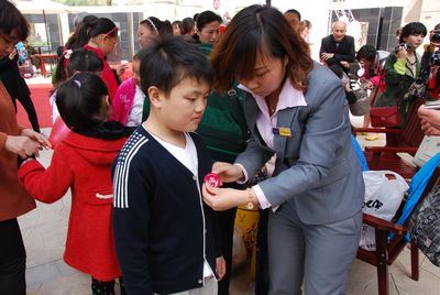 萬象地產(chǎn)的工作人員給捐贈物品的小朋友佩戴“愛心小天使勛章”