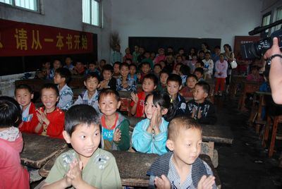 一個半小時的車程,孩子們順利抵達(dá)鄢陵縣南塢鄉(xiāng)劉圪垱小學(xué),校方領(lǐng)導(dǎo)已經(jīng)早早的等候在那里了。工作人員組織孩子們有序下車并分發(fā)雨傘,穿過校園,一行人來到了一排簡陋的教室門前。教室里顯得很黑暗,老舊、殘缺的木桌椅上方,閃亮著一雙雙明亮而又渴望的眼睛?粗晦膱D書擺在課桌上,孩子們情不自禁的發(fā)出一陣陣的歡呼。接著,在萬象地產(chǎn)工作人員和學(xué)校老師的幫助下,兩群孩子們變成了一群,他們坐在一起,讀著同一本書,編織著同一個夢想。