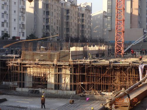 4、萬象藍(lán)天1#樓車庫頂板混凝土澆筑、-1層模板安裝。