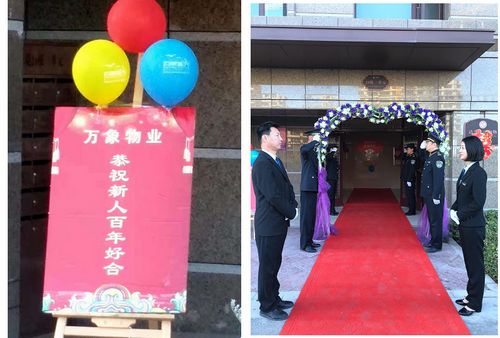 清晨的第一縷陽光灑向大地,萬象水岸香堤小區(qū)28號(hào)樓1單元的門前已是張燈結(jié)彩,喜慶洋洋。原來,今天在這里有一對(duì)新人將要邁進(jìn)婚禮的殿堂。大紅的喜字、鮮紅的地毯、美麗的花門、喜慶的紅綢和樓道里隨處可見的氣球格外的引人注目,特別是物業(yè)公司員工組成的婚禮儀仗隊(duì)與喜慶的氛圍更相得益彰。