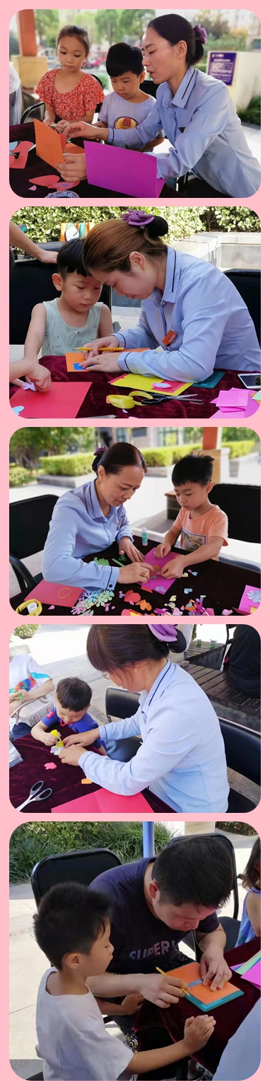 9月8日上午,物管的小姐姐們將提前準備好的剪紙類小裝飾用品及剪刀、雙面膠、水彩筆和賀卡模板妥妥的安置好,熱情的等待著孩子們的到來。