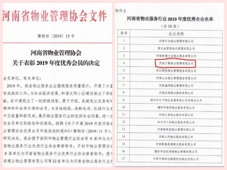在河南省物業(yè)管理協(xié)會第二屆常務理事會擴大會議上,萬象物業(yè)榮獲"河南省物業(yè)服務行業(yè)2019年度優(yōu)秀企業(yè)”的榮譽稱號。這不僅是對萬象物業(yè)工作的肯定,也是鼓勵和鞭策,我們將不忘初心,再接再厲,不斷提升服務品質(zhì),為業(yè)主提供更加優(yōu)質(zhì)完善的物業(yè)服務。