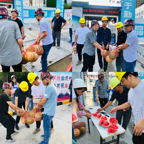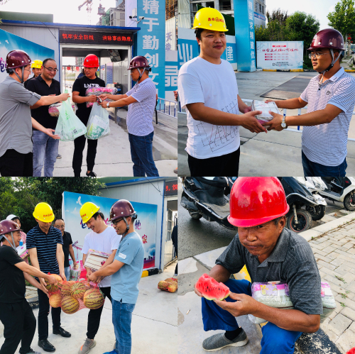 為進一步關(guān)心員工的身心健康,傳遞公司對員工的關(guān)愛,營造良好和諧的工作氛圍。萬象地產(chǎn)慰問了奮斗在工程一線的員工和施工工人們,并給大家?guī)チ饲鍥鼋馐畹臎霾、水果等。一句句關(guān)心的話語,一份份慰問的物品,讓工地一線員工們在炎炎夏日享受到了物質(zhì)、精神的雙重清涼。