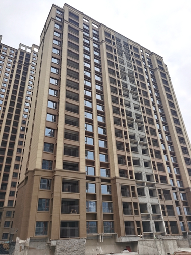 2#樓南側(cè)車(chē)庫(kù)景觀地形整理,道路鋪碎石澆筑混凝土,外墻真石漆施工。
