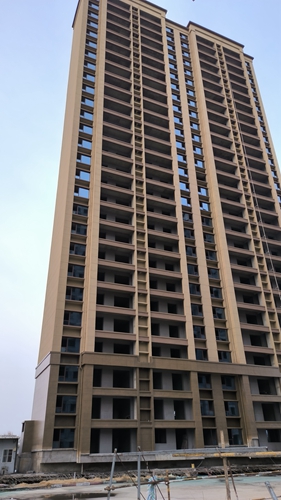 1、1號(hào)樓外墻保溫真石漆完成,內(nèi)墻粉刷完成,窗框玻璃安裝完成。